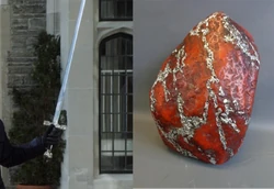 When dormant, neither the Sword nor the brick-red stone possess any unusual powers. When in proximity, however, the stone will glow and the blade of the sword becomes intangible, able to pass effortlessly through solid matter. Analysis of the blade show it to be simple iron, and the stone is an opal vein seemingly originating from Australia. Besides this, neither are particularly remarkable.